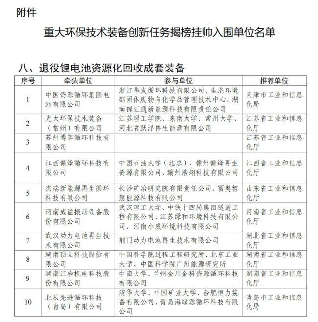 喜报!bat365官网薛银刚教授团队参与项目成功入选工信部2025年重大环保技术装备创新任务揭榜挂帅入围名单2026.03.01近日,工业和信息化部正式公布2025年重大环保技术装备创新任务揭榜挂帅入围名单,由光大环保技术装备(常州)有限公司牵头,我校bat365中文官方网站薛银刚教授团队联合江苏理工学院、东南大学、河北省跃洋再生能源有限公司共同申报的退役锂电池资源化回收成套装备项目成功入选。这是bat365官网在新能源环保领域关键技术攻关方面取得的重要突破,标志着bat365官网在退役锂电池污染控制与资源化研究方向的科研实力得到行业权威认可。直面行业痛点,攻坚核心难题随着我国新能源汽车产业的快速发展,退役锂电池处理处置已成为制约产业可持续发展的关键瓶颈。当前废旧锂电池回收过程普遍存在设备安全性稳定性差、有价金属回收率低、回收产品纯度不足等突出问题,同时回收过程产生的含氟废水等二次污染防控也面临严峻技术挑战。本次揭榜任务针对行业共性痛点,将通过开发密闭破碎设备、低温挥发设备、中温热解设备等关键技术,研制高效稳定的退役锂电池资源化回收成套装备,实现退役锂电池的全链条高效清洁回收。项目预期到2027年完成成套装备研制,核心指标将达到:破碎设备实现全密闭运行,锂离子回收过程安全可靠,单套装备处理规模不低于5000吨/年(以黑粉计),黑粉回收率不低